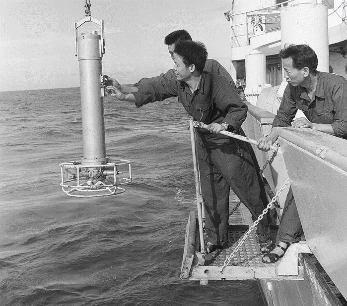 上世紀70年代科研人員布放1000米自容式溫鹽深自記儀
