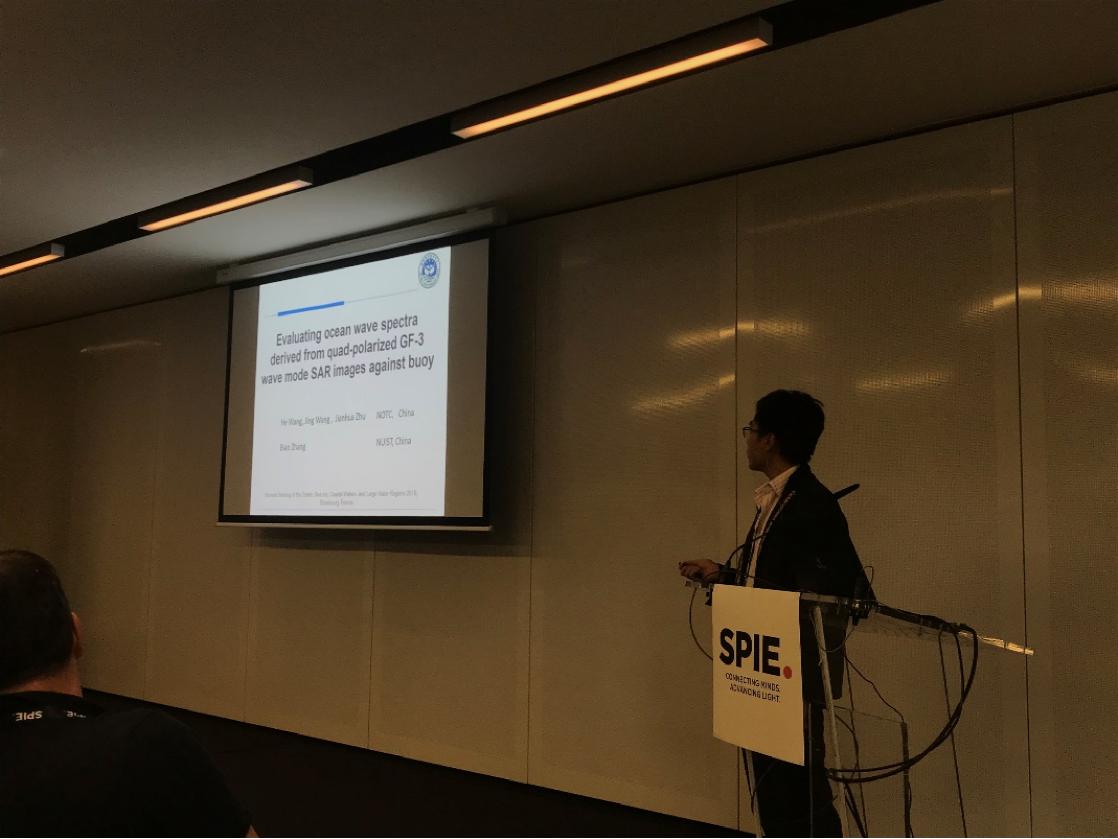 會議期間,王賀副研究員做了題為“Evaluating ocean wave spectra derived from quad-polarized GF-3 wave mode SAR images against buoys”的學術報告,介紹了利用我國自主SAR衛星GF-3全極化波模式數據進行海浪譜反演及其驗證研究的最新進展,并回答了歐洲學者針對新數據集所提出的問題,得到外方專家的充分認可,展示了中心遙感室在SAR衛星海浪反演算法研究方面的最新技術進展。與會期間,王賀副研究員還與來自德國宇航中心、國立臺灣海洋大學、海洋二所的科學家開展了學術交流。